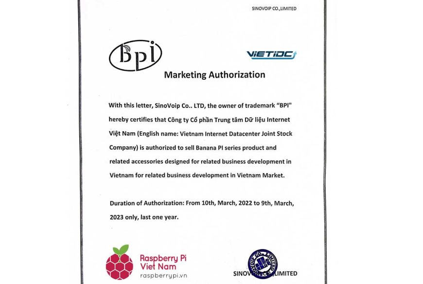 Thư ủy quyền phân phối sản phẩm Banana Pi cho Raspberry Pi Việt Nam (VietIDC)