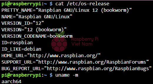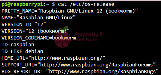Lệnh này hiển thị thông tin chi tiết về tên và phiên bản hệ điều hành mà Raspberry Pi đang sử dụng. Ở đây tôi dùng phiên bản Raspbian GNU/Linux, phiên bản 12 (Bookworm). Điều này giúp bạn biết đang dùng bản Lite/Desktop, Bullseye/Bookworm,… để tra cứu và xử lý phù hợp.
