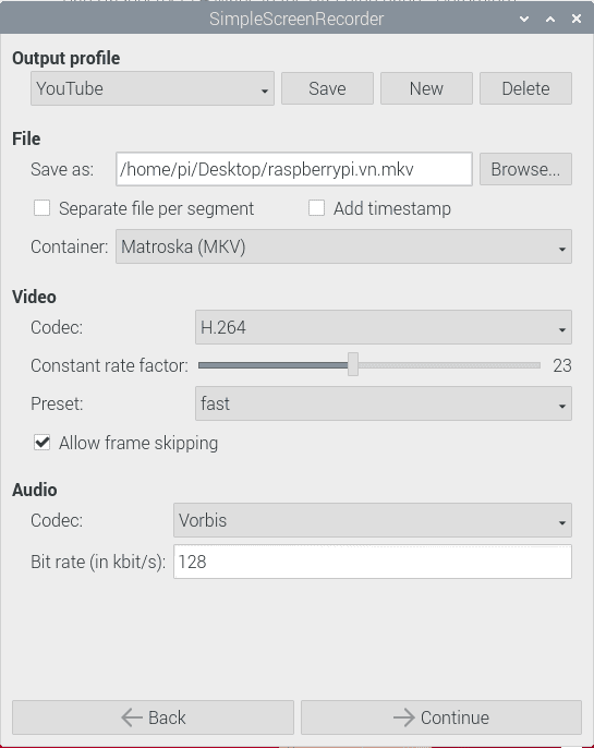 Tại đây, bạn có thể thiết lập quay video, thu audio từ micro và/hoặc thu audio từ âm thanh trong máy tính Raspberry Pi của bạn. Ngoài ra bạn có thể thiết lập định dạng video (mặc định là MKV), nơi lưu file sau khi quay, codec vide, …