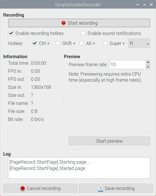 Cuối cùng, bạn chỉ cần bấm nút Start Recording. Hoặc đơn giản hơn, bạn ghi nhớ phím tắt Ctrl + R để thực hiện quay và dừng quay video màn hình Raspbian.