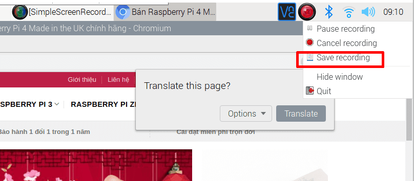 Sau khi quay xong, bạn phải thực hiện save file bằng cách bấm phím tắt Ctrl + R để dừng quay. Sau đó nhìn lên góc trên phải màn hình, nơi có hiển thị icon của SimpleScreenRecorder, bạn chuột phải vào icon rồi chọn Save Recording.