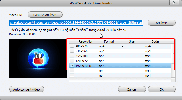 Bước tiếp theo, bạn bấm nút Analyze và chờ vài giây. Phần mềm sẽ detect video đồng thời tiến hành xuất ra cho các bạn video với nhiều độ phân giải, định dạng và chất lượng khác nhau. Các bạn chỉ cần tick vào các định dạng video mình mong muốn và bấm nút OK như hình dưới là được