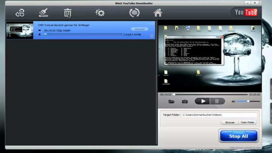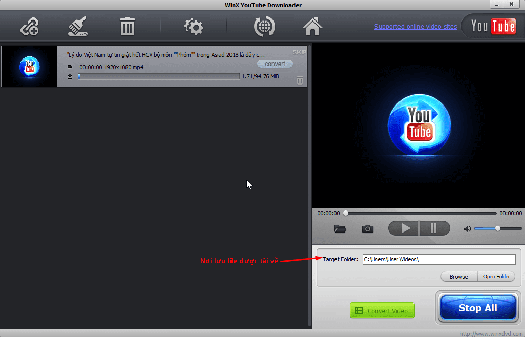Bước cuối cùng, bạn bấm nút DOWNLOAD trên phần mềm và chờ vài phút. WinX Youtube Downloader sẽ tiến hành tải về cho các bạn rồi lưu trong folder ở phần Target Folder
