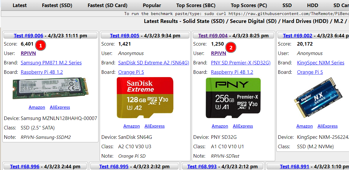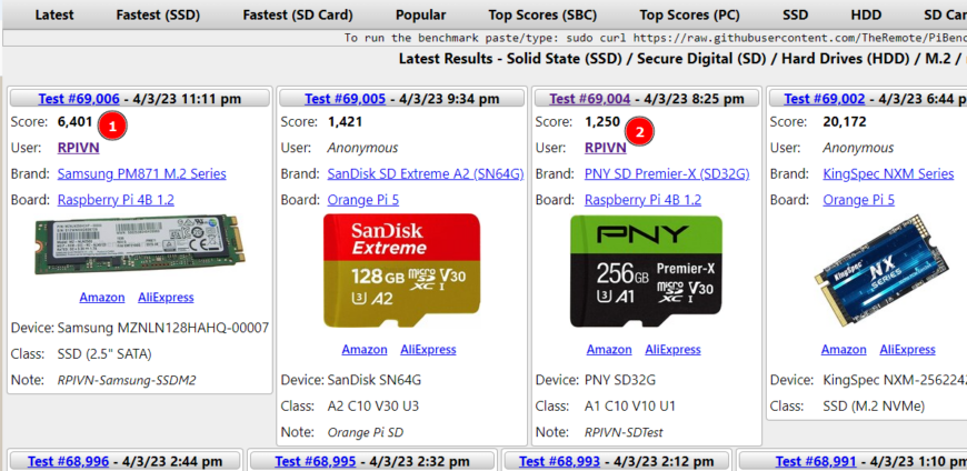 Sau khi chạy lệnh trên, bạn sẽ chờ vài phút để cài đặt script và thực hiện test. Có kết quả, bạn có thể ghi lại ghi chú về lần test, người thực hiện test rồi chờ vài phút sẽ có kết quả tổng hợp trên website https://pibenchmarks.com/. Trong hình dưới bạn có thể thấy chúng tôi thực hiện test 2 lần với ổ SSD và thẻ nhớ.