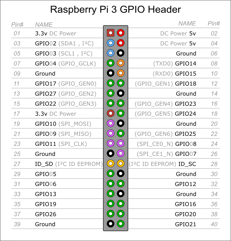 Một trong những ứng dụng chủ yếu của Raspberry Pi là sử dụng trong các thiết bị điều khiển tự động. Để tiến hành điều khiển, đọc, nhận dữ liệu từ các thiết bị bên ngoài chúng ta cần thao tác với các chân cắm mở  rộng trên kit Raspberry Pi. Ví dụ các chân cắm mở rộng của kít Raspberry Pi 3 như hình dưới: