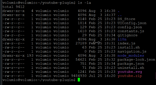 Sau khi giải nén, bạn sẽ được các file nhìn như thế này (dùng lệnh ls -la để hiển thị các file/folder trong thư mục youtube-plugin)