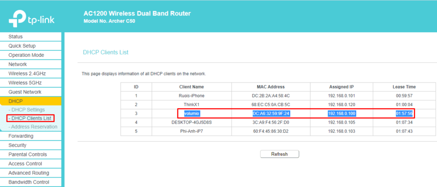Trên router, sau khi cắm dây mạng và khởi động Pi bạn sẽ thấy thiết bị có tên volumio