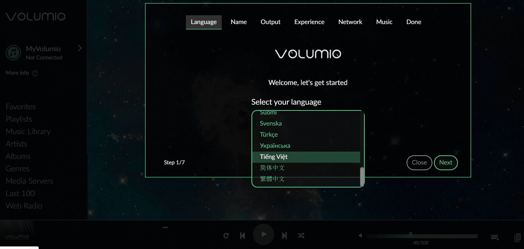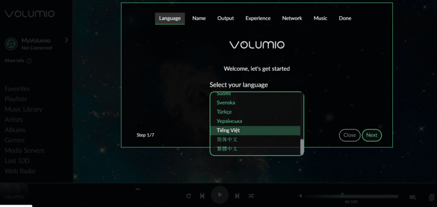 Bước đầu tiên, bạn cần chọn ngôn ngữ sử dụng. Điều tuyệt vời là Volumio có ngôn ngữ tiếng Việt. Tôi được biết, gói ngôn ngữ này do anh LongMobi biên dịch, xin gửi đến anh lời cảm ơn sâu sắc vì đóng góp vô cùng ý nghĩa này.