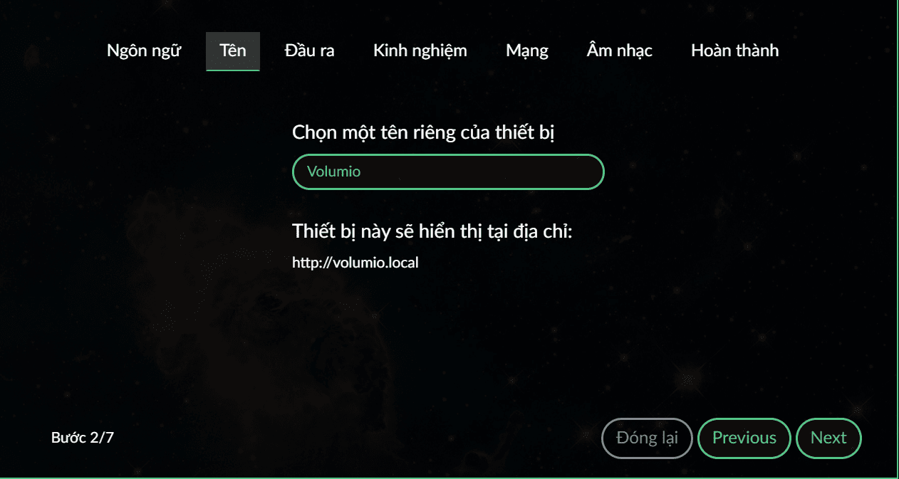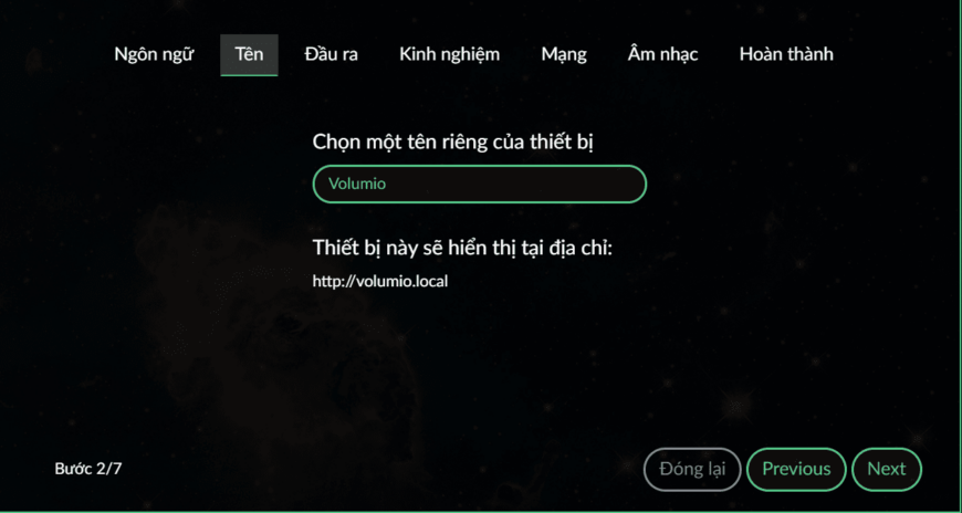 Sau đó, bạn có thể đặt tên cho thiết bị của mình. Nếu không có nhu cầu bạn bỏ qua. Trường hợp đặt lại tên, sau này bạn có thể truy cập vào volumio qua địa chỉ http://ten-ban-da-dat.local
