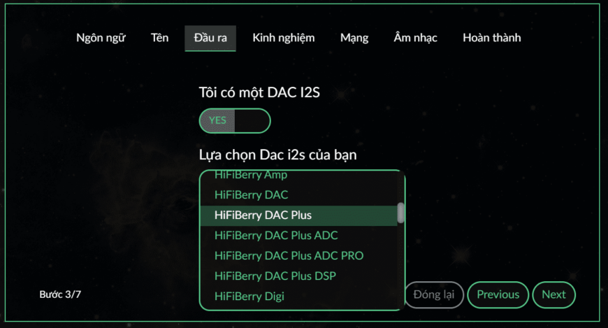 Bước tiếp theo, Volumio sẽ hỏi bạn có muốn sử dụng DAC hay không. Nếu bạn đang cắm DAC vào mạch Pi, nó sẽ tự nhận và hiển thị danh sách các loại DAC để bạn lựa chọn. Trong hướng dẫn này, tôi sử dụng Pifi DAC+ nên lựa chọn như hình dưới
