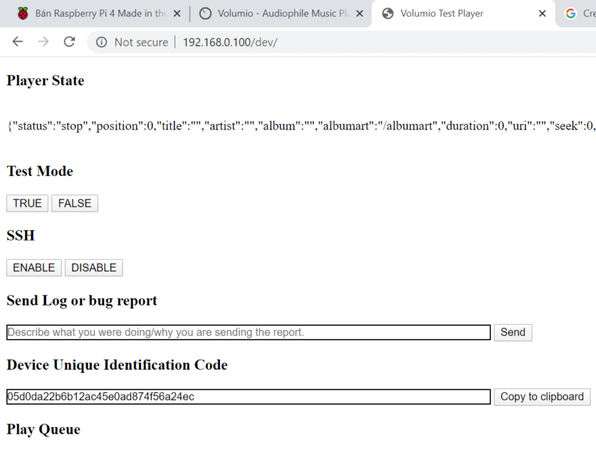 Để bật SSH trên Volumio, bạn truy cập địa chỉ IP của volumio trên trình duyệt và thêm đoạn /dev/ vào sau. Ví dụ của tôi sẽ là http://192.168.0.100/dev. Cửa sổ thiết lập hiện ra và bạn bấm nút Enable ở phần SSH
