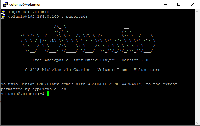 Màn hình sau khi đăng nhập SSH vào Volumio thành công