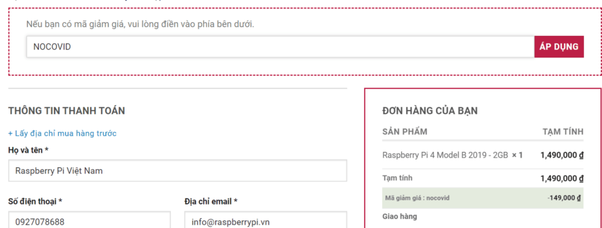Tiếp tục trong chuỗi hoạt động Chung tay đẩy lùi dịch bênh Covid – 19, Raspberry Pi Việt Nam triển khai chương trình ưu đãi đặc biệt dành cho các đơn hàng thanh toán online hoặc chuyển khoản.