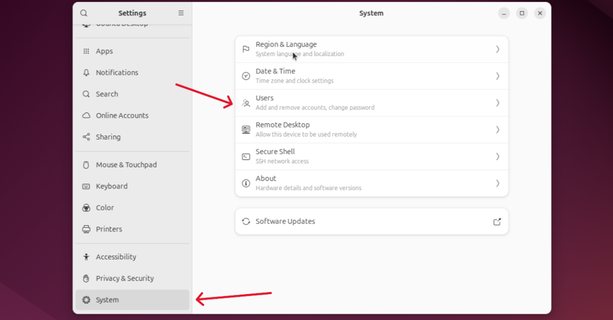 Trong Setting, chọn vào System → Users, sau đó nhấp vào nút Unlock ở góc trên bên phải và nhập mật khẩu để xác thực.