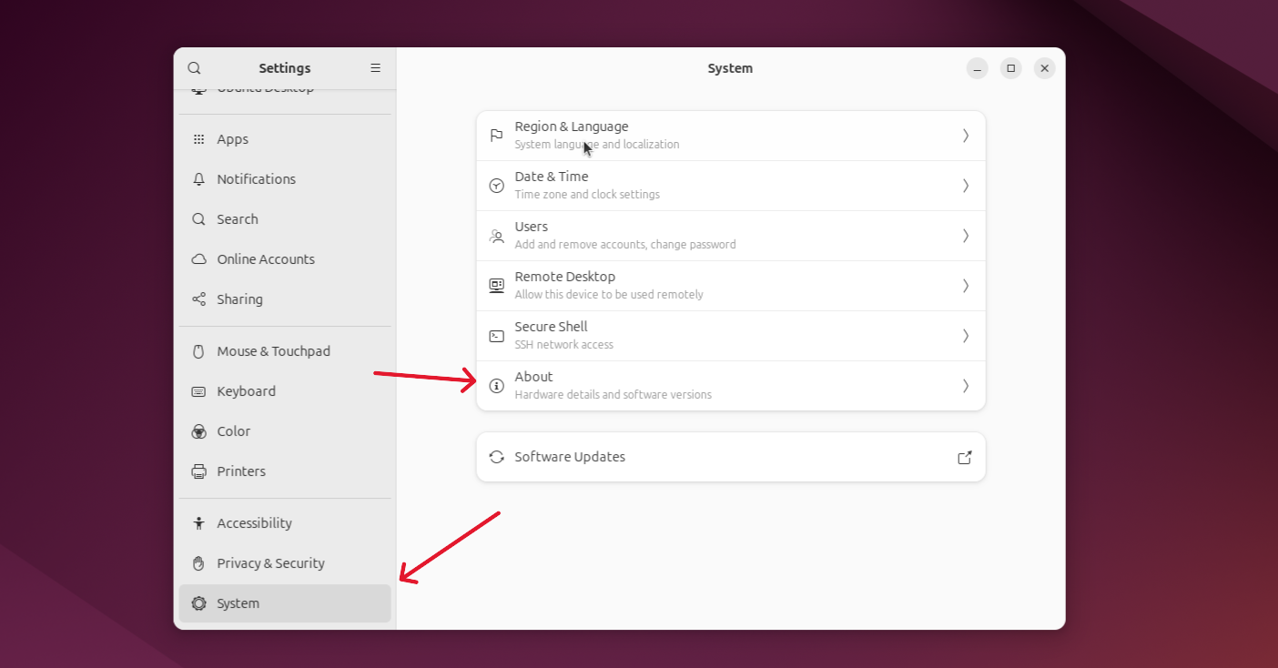 Để kiểm tra xem bạn đang sử dụng Xorg hay Wayland trên Ubuntu, mở Setting và chuyển đến mục About.