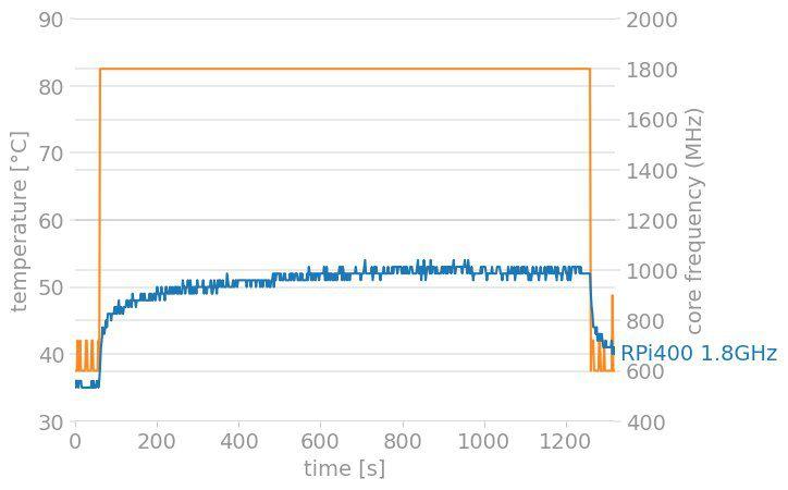 Đúng, bạn không nhầm đâu. Raspberry Pi 400 sử dụng SoC BCM2711C0 có tốc độ 1,8 GHz (tốc độ xung nhịp tối đa mặc định của nhà sản xuất), nhưng nó không yêu cầu bất kỳ thiết bị làm mát bổ sung nào mặc dù bo mạch chủ được gắn dưới bàn phím, có thể nói là khá kín. Chúng tôi đã chạy thử nghiệm stress test trên máy tính mới này trong 20 phút với full tải đầy đủ trên mọi core, nhiệt độ CPU tăng từ ~ 35ºC nhưng vẫn dưới 55ºC. Thật đáng kinh ngạc! Để bạn dễ hình dung, bo mạch Raspberry Pi 4 Model B nếu chạy các tác vụ thông thường đã nóng khoảng 55 – 60oC. Công thức bí mật của hiệu suất tản nhiệt tốt này là một tấm tản nhiệt nhôm được thiết kế thông minh gắn trên đầu CPU (bên dưới bàn phím) để đảm bảo Raspberry Pi 400 luôn hoạt động mát mẻ. Bạn cũng có thể tham khảo thêm bài stress test của Cytron tại đây.