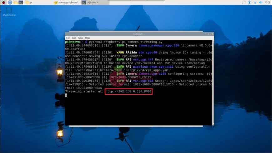 Sau khi chạy chương trình Python, địa chỉ web để truy cập luồng video của camera giám sát sẽ được hiển thị ngay trên màn hình terminal (ví dụ: http://192.168.0.134:8000). Đây chính là địa chỉ IP nội bộ của Raspberry Pi, kết hợp với cổng 8000 mà chương trình đã mở sẵn để truyền dữ liệu.