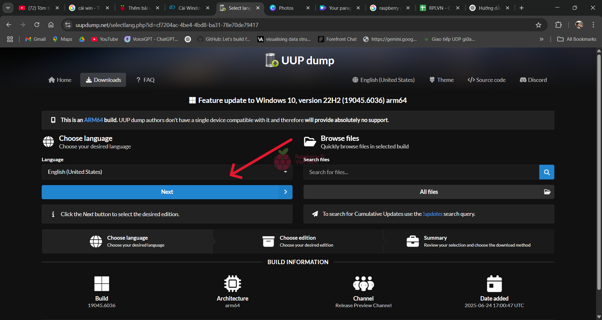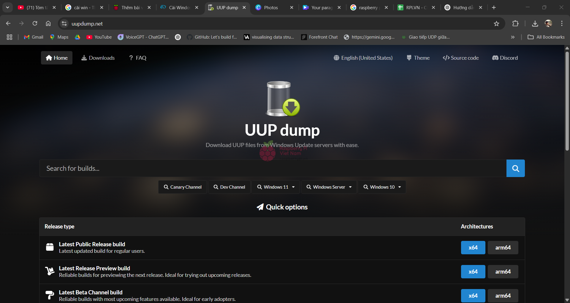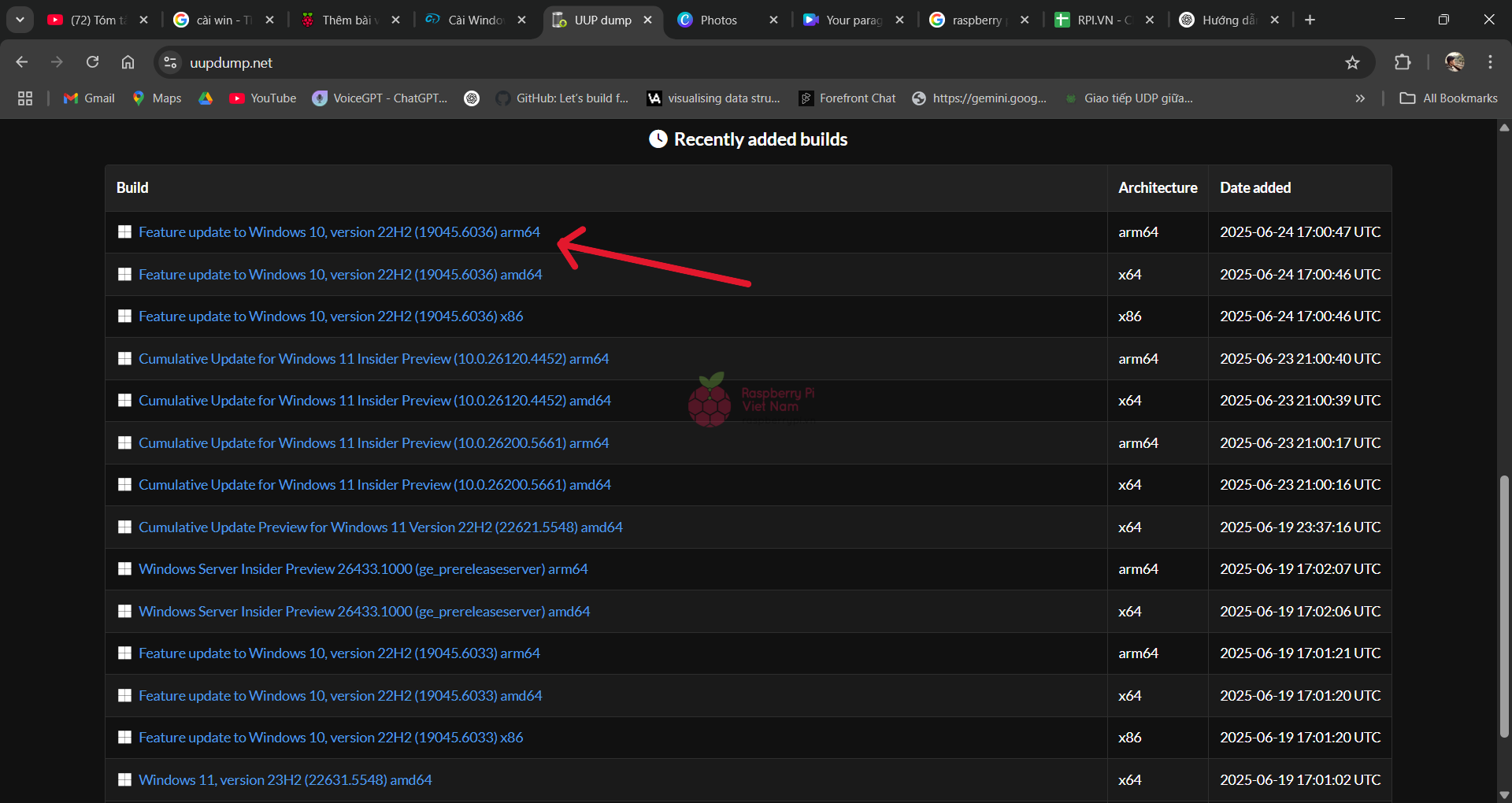 Các bạn có thể tải phiên bản Windows 11 mới nhất tại mục Latest Public Release build. Trong bài viết này, mình sẽ chọn Window 10 để Raspberry Pi 4 có thể hoạt động ổn định hơn.