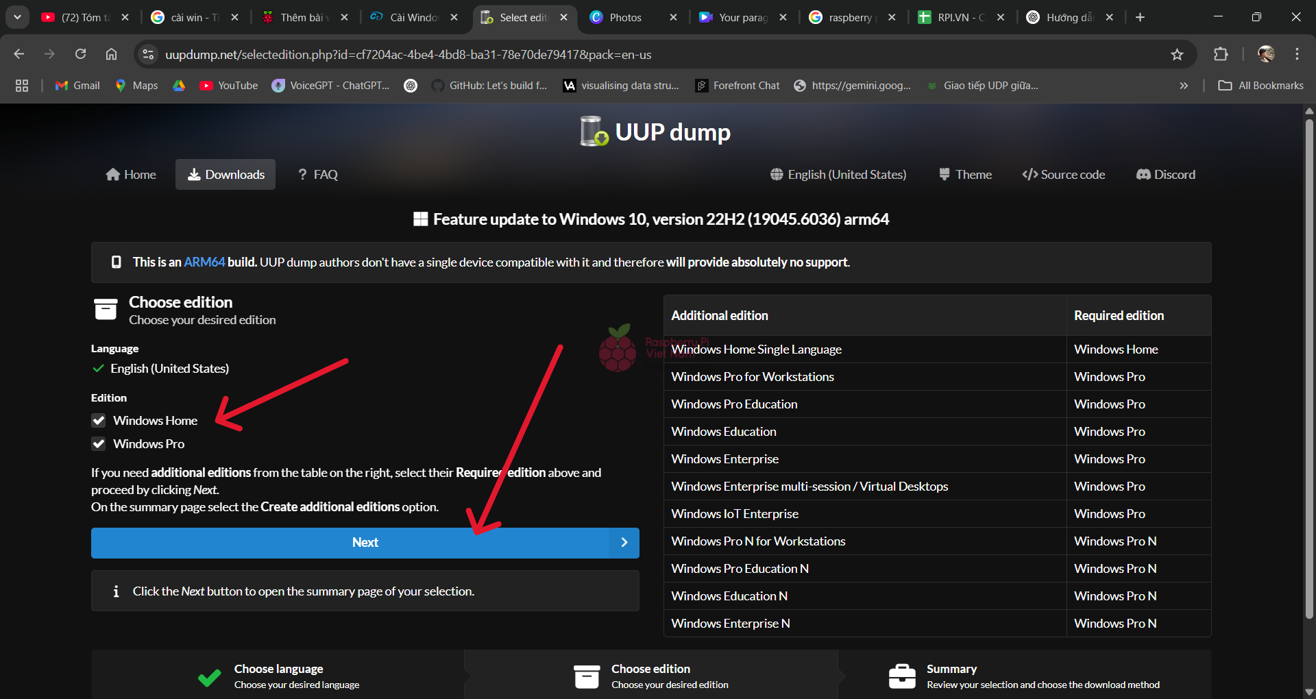 Ở đây, bạn có thể lựa chọn tải về Window 10 bản Home hoặc Pro hoặc có thể là cả hai nếu muốn. Sau đó chọn Next để tiếp tục.