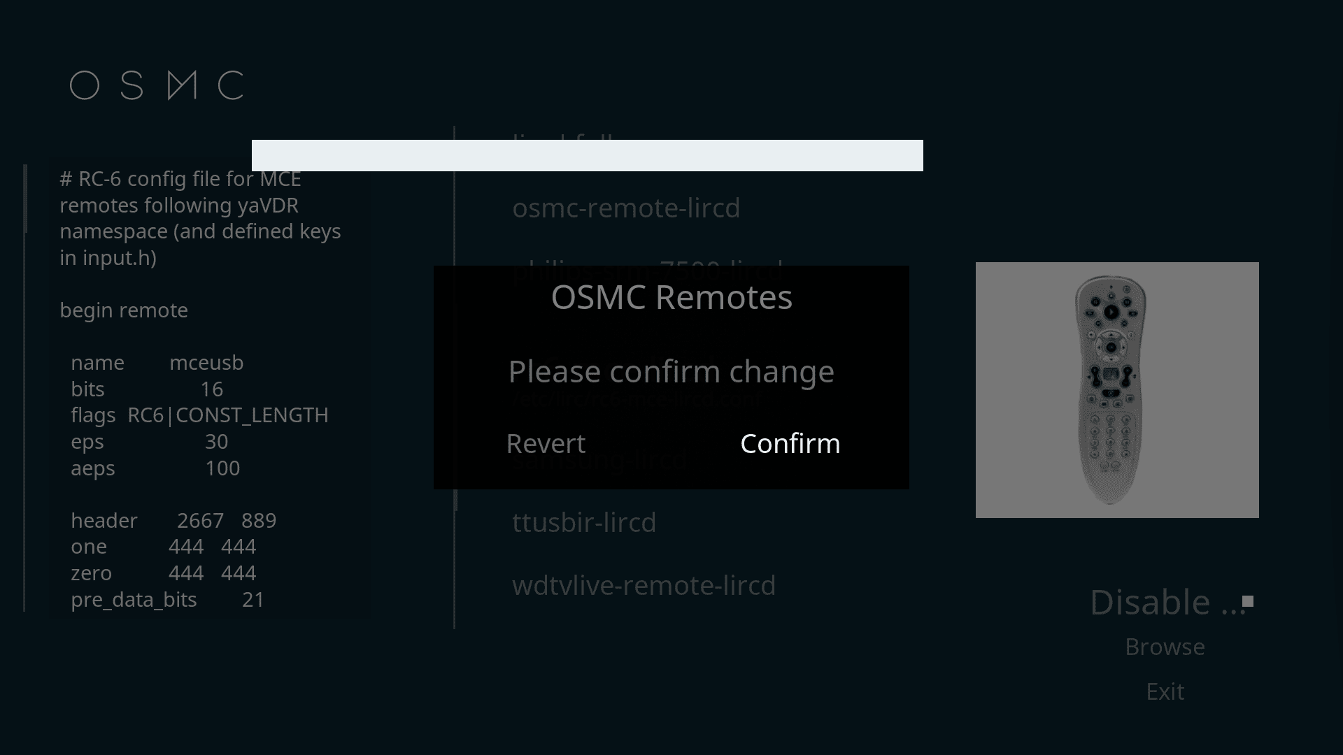 Sau đó, truy cập vào menu Remote trong My OSMC và lưa chọn đến thiết bị có tên rc6-mce-lircd và tiến hành kích hoạt nó lên. Nếu có yêu cầu xác nhận hãy chọn Confirm như các hình dưới đây