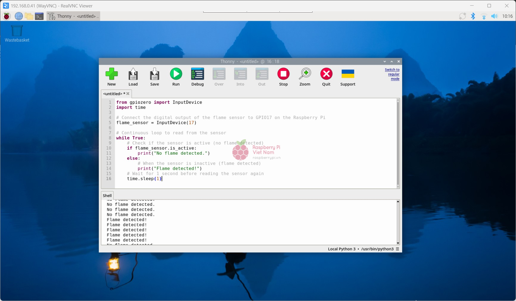 Qua bài viết này, chúng ta đã tìm hiểu cách kết nối và lập trình cảm biến lửa (Flame Sensor) với Raspberry Pi 4 bằng ngôn ngữ Python trong môi trường Thonny IDE. Kết quả cho thấy khi đưa cảm biến đến gần nguồn phát sáng như ngọn lửa, thiết bị sẽ phát hiện và hiển thị cảnh báo "Flame detected!"