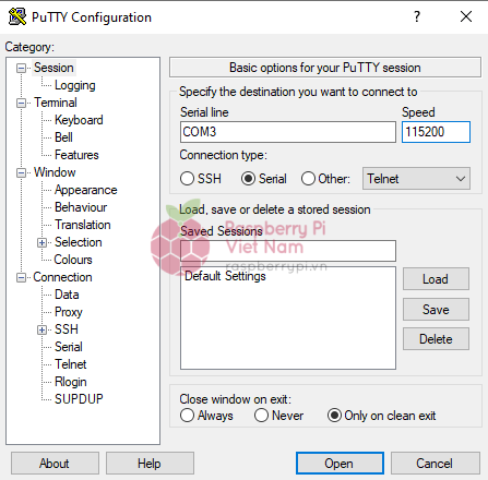 Mở Device Manager trên Windows, mở rộng phần Ports (COM & LPT), tìm thiết bị có tên như “Prolific USB-to-Serial Comm Port (COMx)”Mở Putty. Chọn Connection type: Serial. Nhập Serial line là COM port bạn tìm được (ví dụ: COM3). Đặt Speed (baud) là 115200. Nhấn Open
