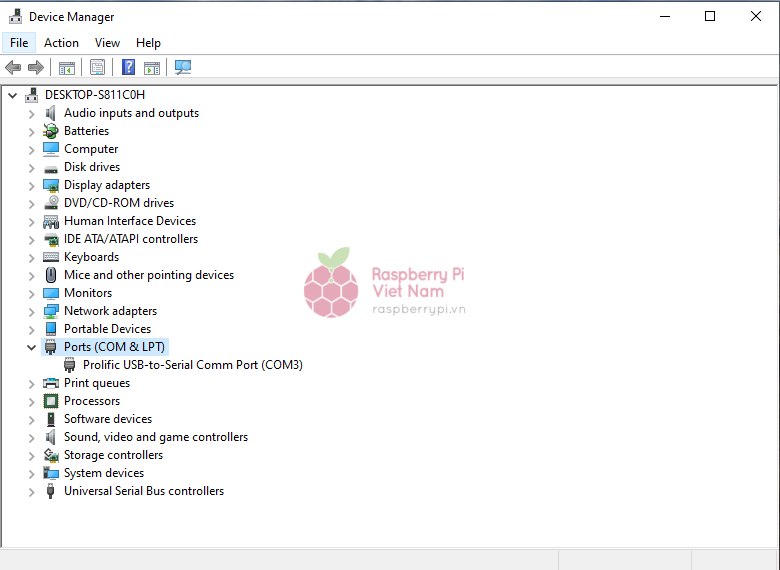 Driver PL2303 dành cho cáp USB-UART. Tải tại:https://www.waveshare.net/w/upload/6/64/PL2303_Windows_Driver.7z