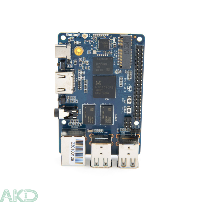 Mạch Banana Pi BPI-M4 là một máy tính mini dạng Single Board Computer 64-bit, sử dụng vi xử lý lõi tứ Cortex-A53 Realtek RTD1395. Bo mạch được trang bị tùy chọn RAM 1GB hoặc 2GB, bộ nhớ eMMC 8GB, đồng thời tích hợp sẵn WiFi chuẩn b/g/n/ac và Bluetooth 4.2. Về khả năng kết nối, BPI-M4 sở hữu 4 cổng USB 2.0, 1 cổng USB Type-C, 1 cổng HDMI, 1 jack âm thanh và hỗ trợ giao diện M.2 Key E PCIe 2.0.