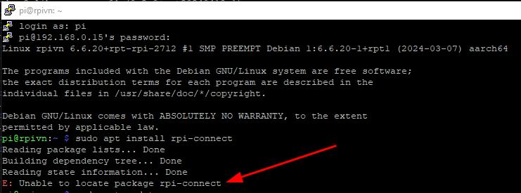 Lưu ý, bạn cần phải chạy 2 lệnh update và upgrade. Nếu không, khi chạy lệnh cài rpi-connect sẽ bị báo lỗi như dưới đây