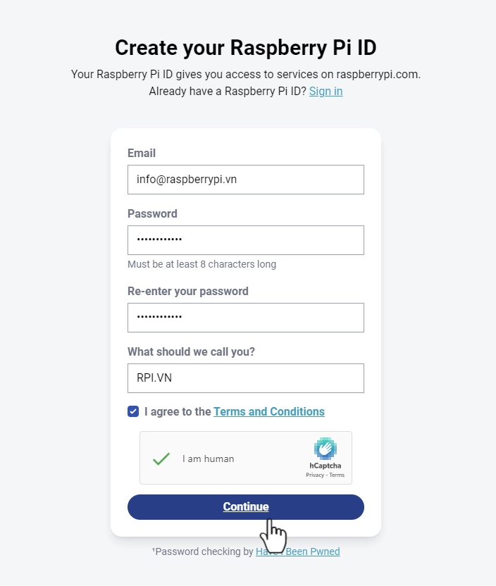 Cài đặt xong, bạn sẽ cần đăng nhập Raspberry Pi ID (Pi ID) để sử dụng. Nếu chưa có tài khoản, bạn có thể đăng ký tại đây. Quá trình đăng ký khá đơn giản, bạn chỉ cần nhập email, password như hình phía dưới