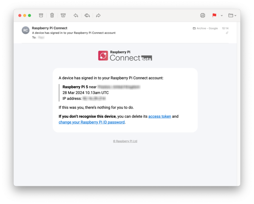 Ngày 07/05/2024, CTO của hãng Raspberry Pi – Gordon Hollingworth đã giới thiệu một phần mềm mới do chính đội ngũ của họ phát triển để giúp người dùng Raspberry Pi có thể truy cập điều khiển và quản lý bo mạch của mình từ xa qua Internet một cách đơn giản, bảo mật. Ứng dụng có tên gọi Raspberry Pi Connect.