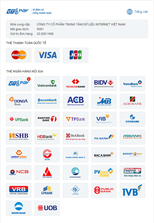 - Hỗ trợ 33 ngân hàng trên toàn quốc: Với việc tích hợp cổng thanh toán VTC Pay, Quý khách có thể thanh toán thông qua 33 ngân hàng trong nước.