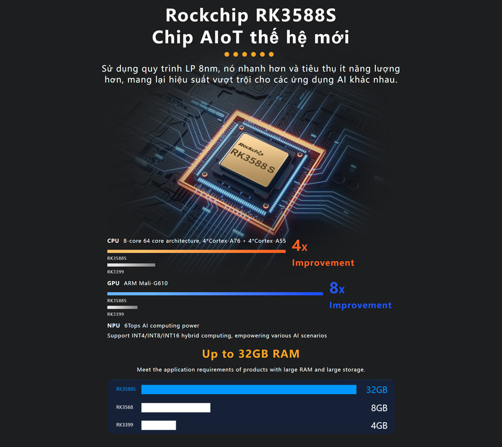 Orange Pi 5 sử dụng chip Rockchip RK3588S, một chip lõi 8 64-bit mới nhất hiện nay, trong đó có 4 lõi là chip A76 và 4 lõi là chip A55, sử dụng công nghệ thiết kế 8 nanomet hiện đại nhất hiện nay, cho phép xung chip có thể đạt tới 2.4GHz, tích hợp cùng trong đó là chip đồ họa ARM Mali-G610 “Odin” 3D GPU, và sẵn luôn cả NPU (Neural Processing Unit) chip xử lý trí tuệ nhân tạo với 6 TOPS, hỗ trợ hoạt động đồng thời INT4/INT8/INT16.