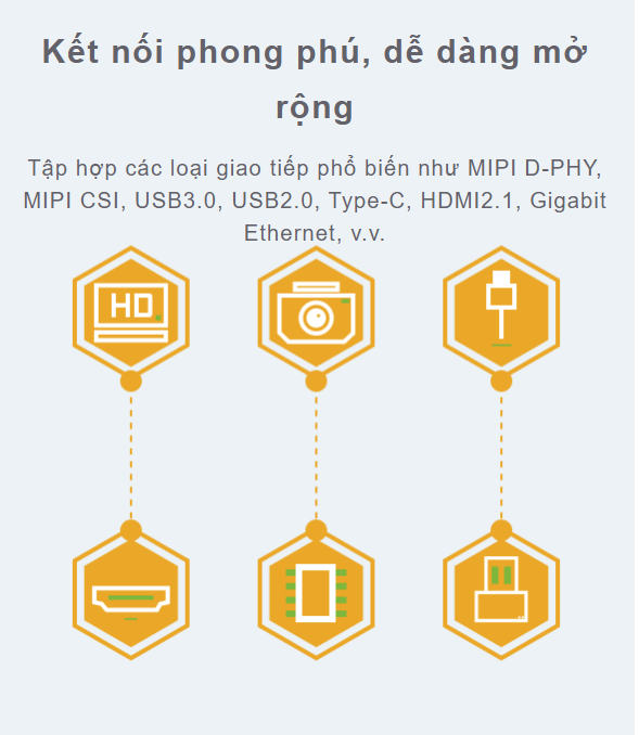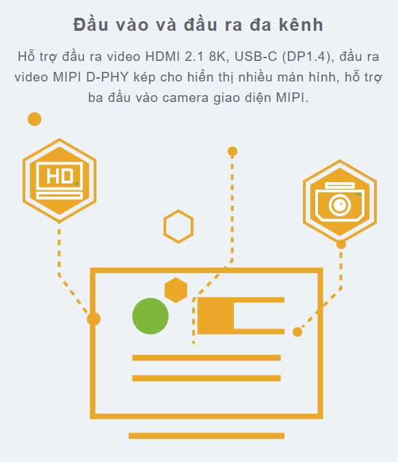 Hỗ trợ đầu ra video HDMI 2.1 8K, USB-C (DP1.4), đầu ra video MIPI D-PHY kép cho màn hình đa màn hình, hỗ trợ ba đầu vào camera giao diện MIPI.