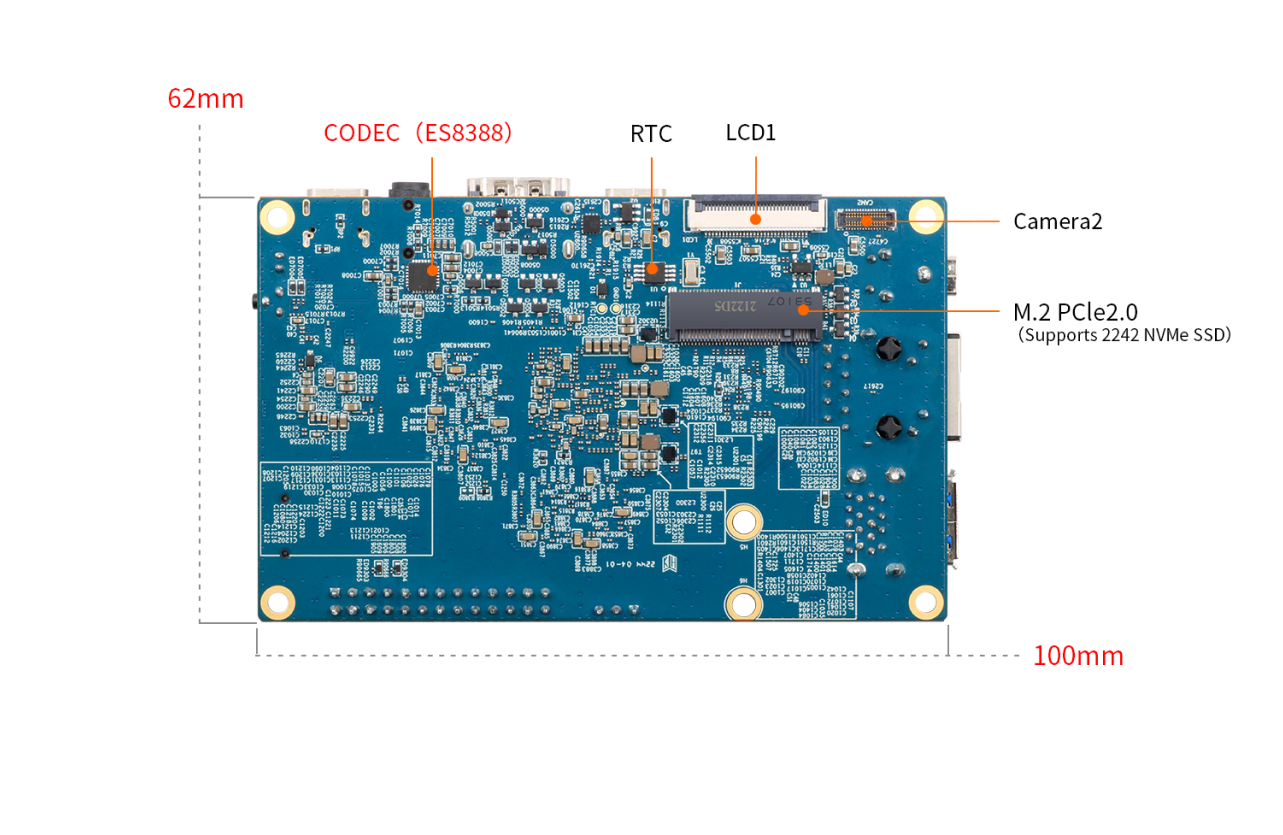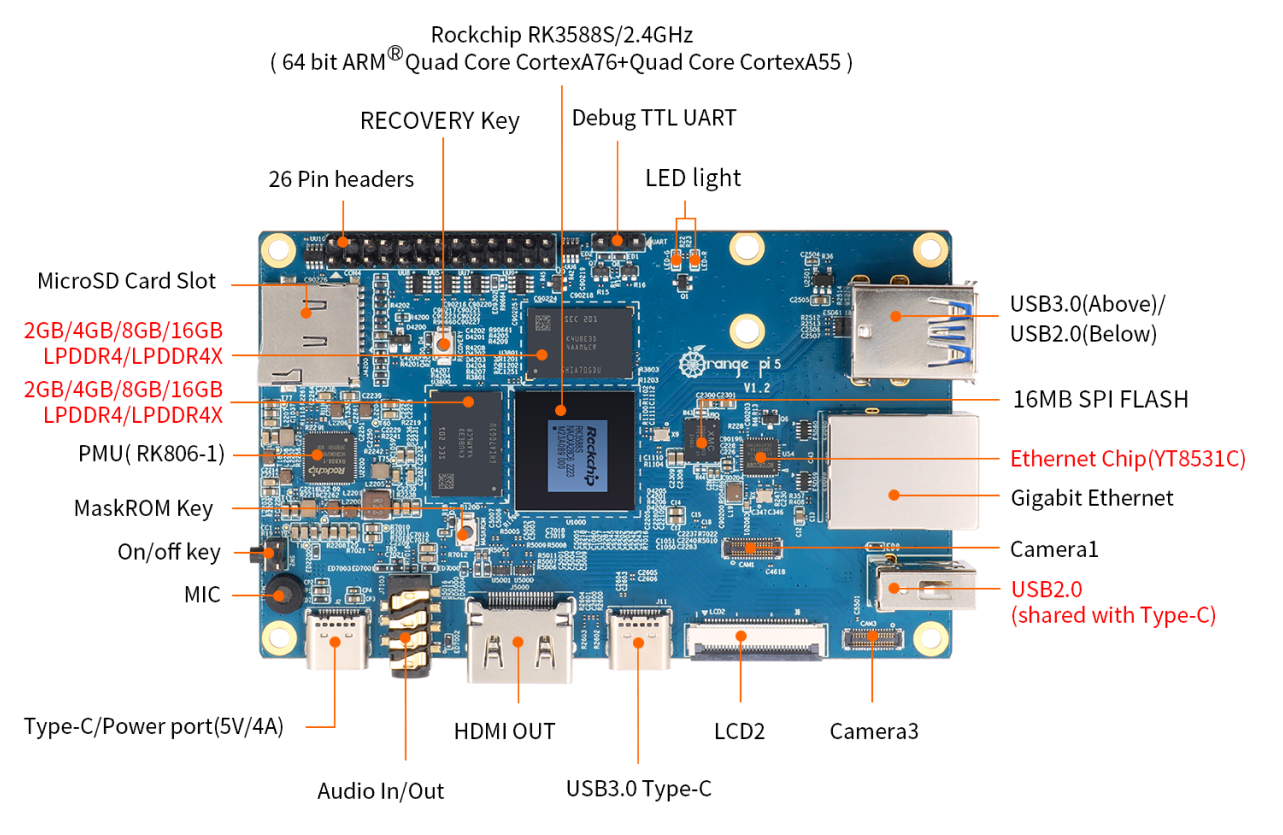 Orange Pi 5 sử dụng bộ xử lý Rockchip RK3588S 8 nhân 64-bit thế hệ mới, A76 lõi tứ + A55 lõi tứ, với thiết kế tiến trình 8nm, tần số chính lên đến 2.4GHz, tích hợp GPU ARM Mali-G610, nhúng mô-đun tăng tốc hình ảnh 3D / 2D hiệu suất cao, NPU tích hợp với sức mạnh tính toán 6Tops, với 4GB/8GB/16GB/32GB (LPDDR4/4x) và khả năng xử lý màn hình lên đến 8K.
