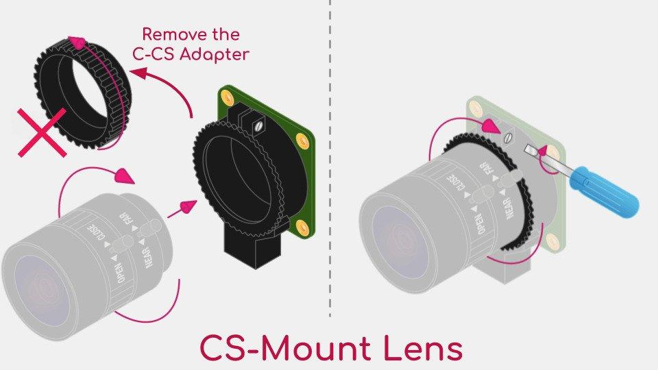 Ống kính góc rộng Raspberry Pi 6 mm sử dụng ngàm CS, vì vậy khi lắp bạn sẽ cần tháo C/CS Adapter ra khỏi HQ Camera như hình dưới đây