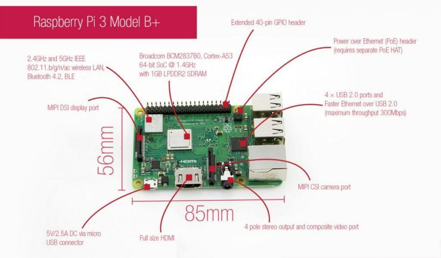 - Vi xử lý: Broadcom BCM2837B0, quad-core A53 (ARMv8) 64-bit SoC @1.4GHz