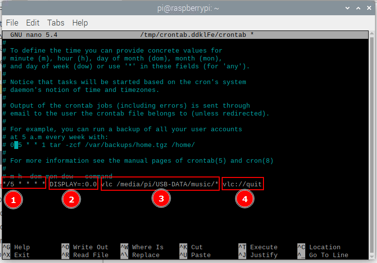 */5 * * * * DISPLAY=:0.0 vlc /media/pi/USB-DATA/music/* vlc://quit