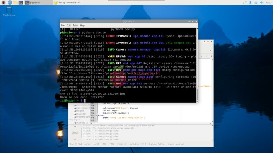 Sau khi chạy chương trình, trên màn hình terminal sẽ hiển thị biển số xe như hình dưới. Ảnh chụp của biển số xe cũng sẽ được lưu lại ở trong một file trên Raspberry Pi.